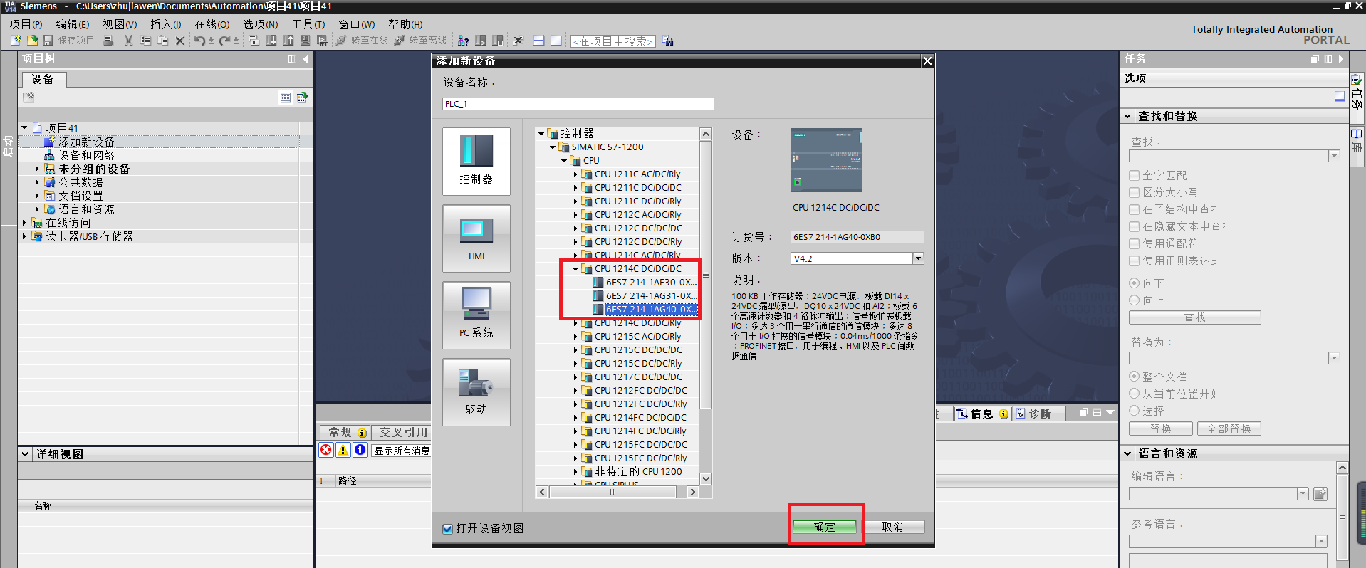 ①以S7-1200為例,先點擊添加新設(shè)備,然后在SIMATIC S7-1200里添加一個1214C CPU,然后,點確定。
