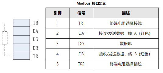 模塊使用自用2*5Pin歐式彈簧端子作為 Modbus RTU 通信的物理接口,其中兩個 TR 是終端電阻選接線。在內(nèi)部模塊內(nèi)部集成了 120Ω 的終端電阻。當 TR1 與 DA, TR2 與 DB 短接終端電阻有效。接口定義如下表所示