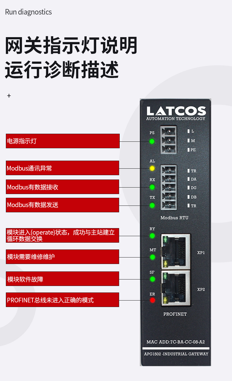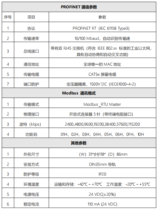 LED 指示分為三類指示。其中包括電源指示,Modbus 狀態(tài)指示,profinet 狀態(tài)指示,定義如表 下圖所示