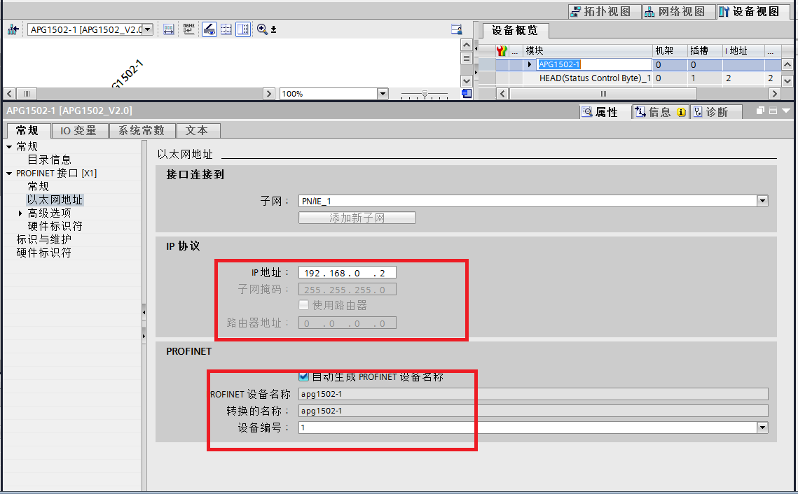 ④分布式IO名稱分配,點擊屬性,點開屬性以后,在以太網(wǎng)地址中的,查看IP地址和profinet設(shè)備名稱,如下圖所示